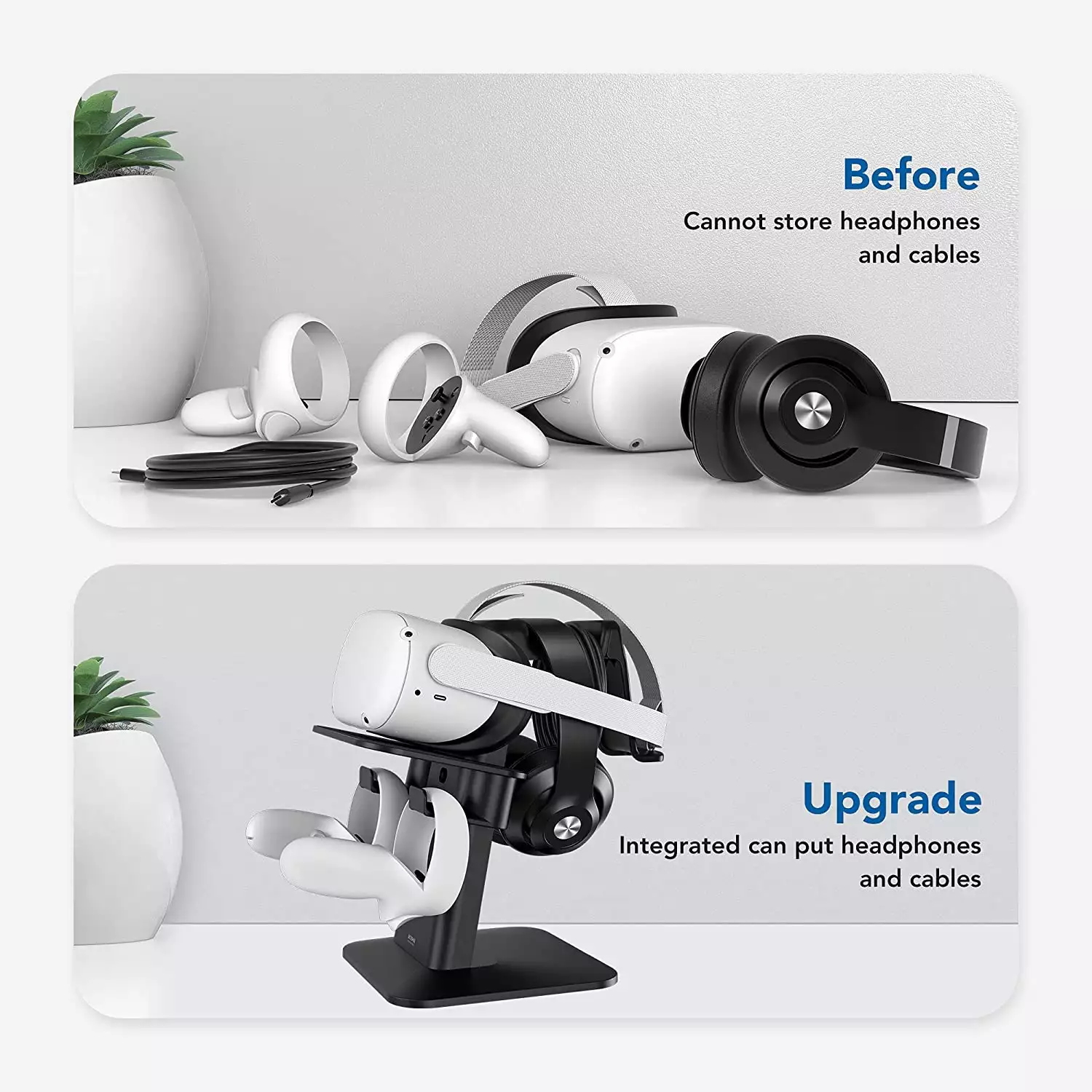 - One for All - Now not only you can put VR headsets and controllers on an upgraded VR stand, but you can put more things such as headsets, extended data cables, and Head Strap. One upgraded VR stand solves all your storage problems